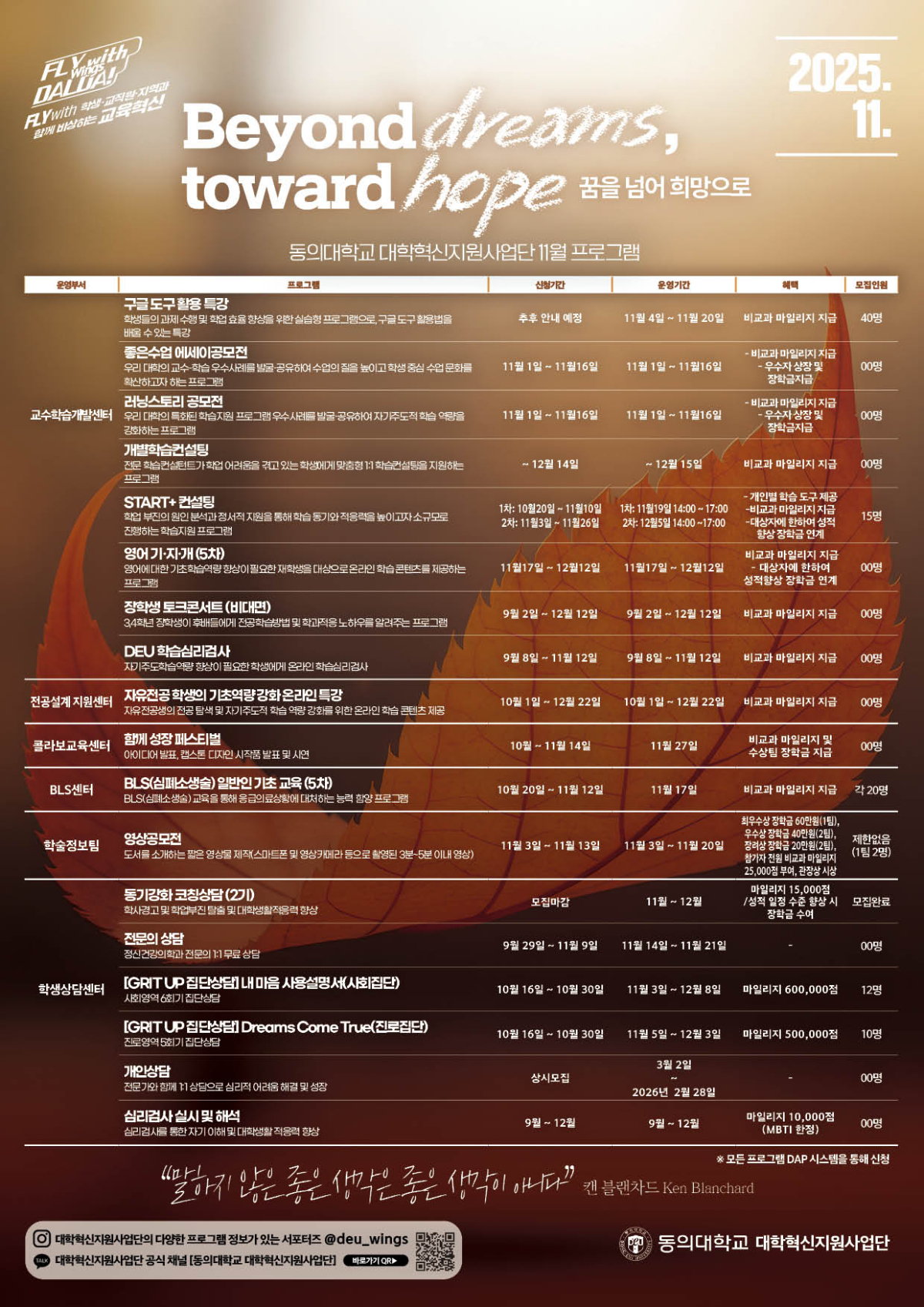 1. 2025학년도 대학혁신지원사업단에서는 성과 확산 및 공유를 위한 혁신사업 참여 콘테스트를 운영하고자 이에 따른 월간 프로그램(11월) 운영 계획표를 안내드립니다.